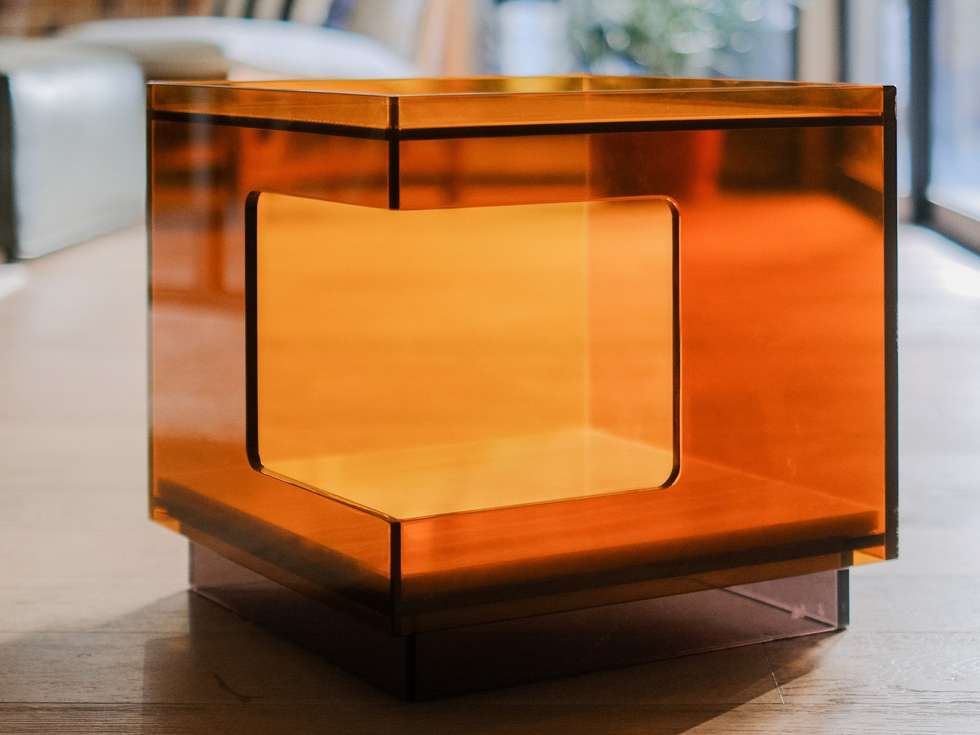 The Phoenix Side Table is a striking blend of materials and design. Featuring a rich brown acrylic outer layer.