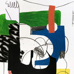 Coordinated Contradictory Movements is a colorful and expressive work by Luc AM Pierre. The piece features a mix of bold shapes, strong lines, and bright colors like green, blue, red, yellow, and black. Each form seems to move in a different direction, but together they create a balanced and energetic composition.