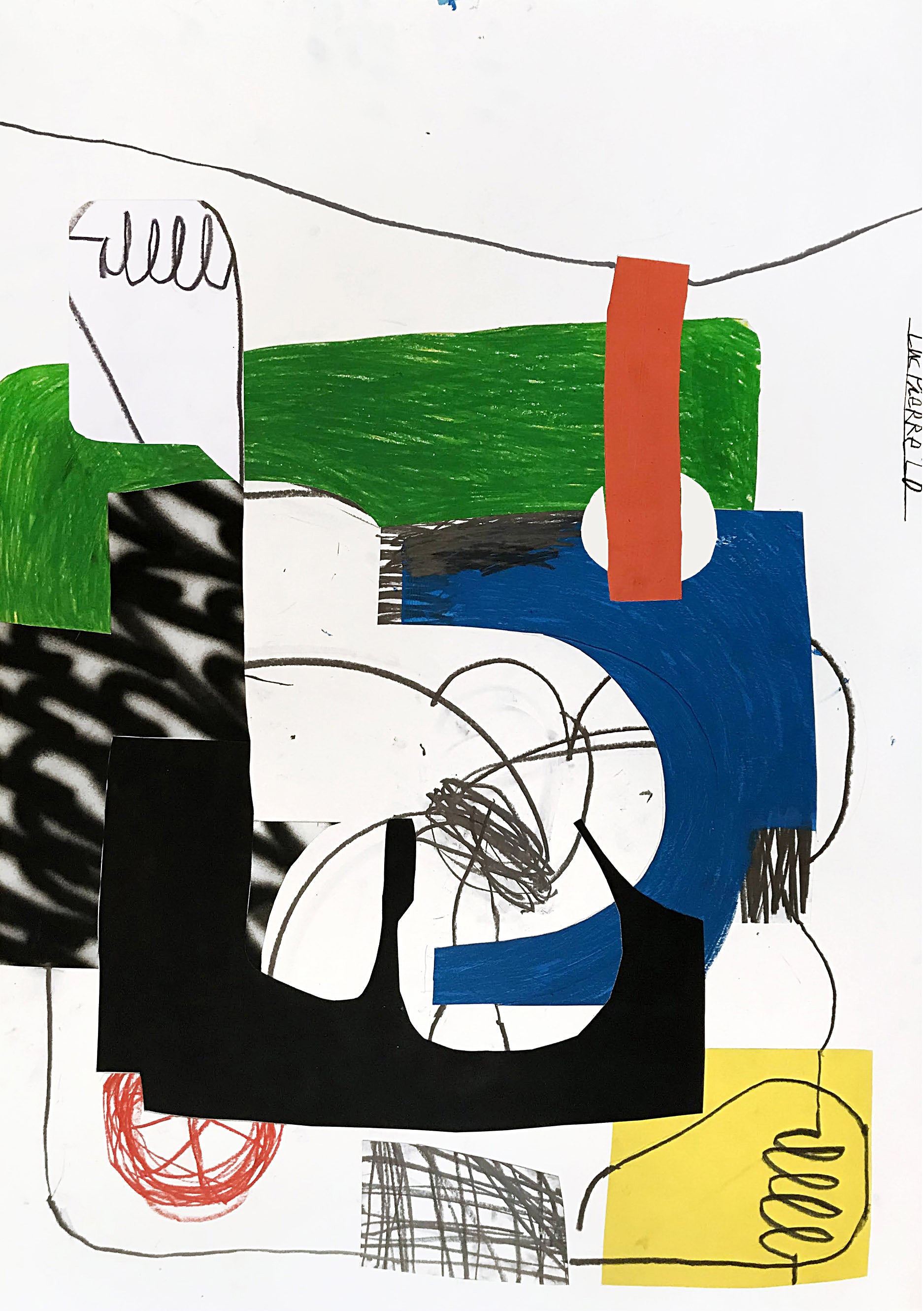 Luc AM Pierre combines hand-drawn marks with cut paper and painted elements. His method is both careful and spontaneous. Shapes overlap and twist through the space, showing a sense of movement and tension.