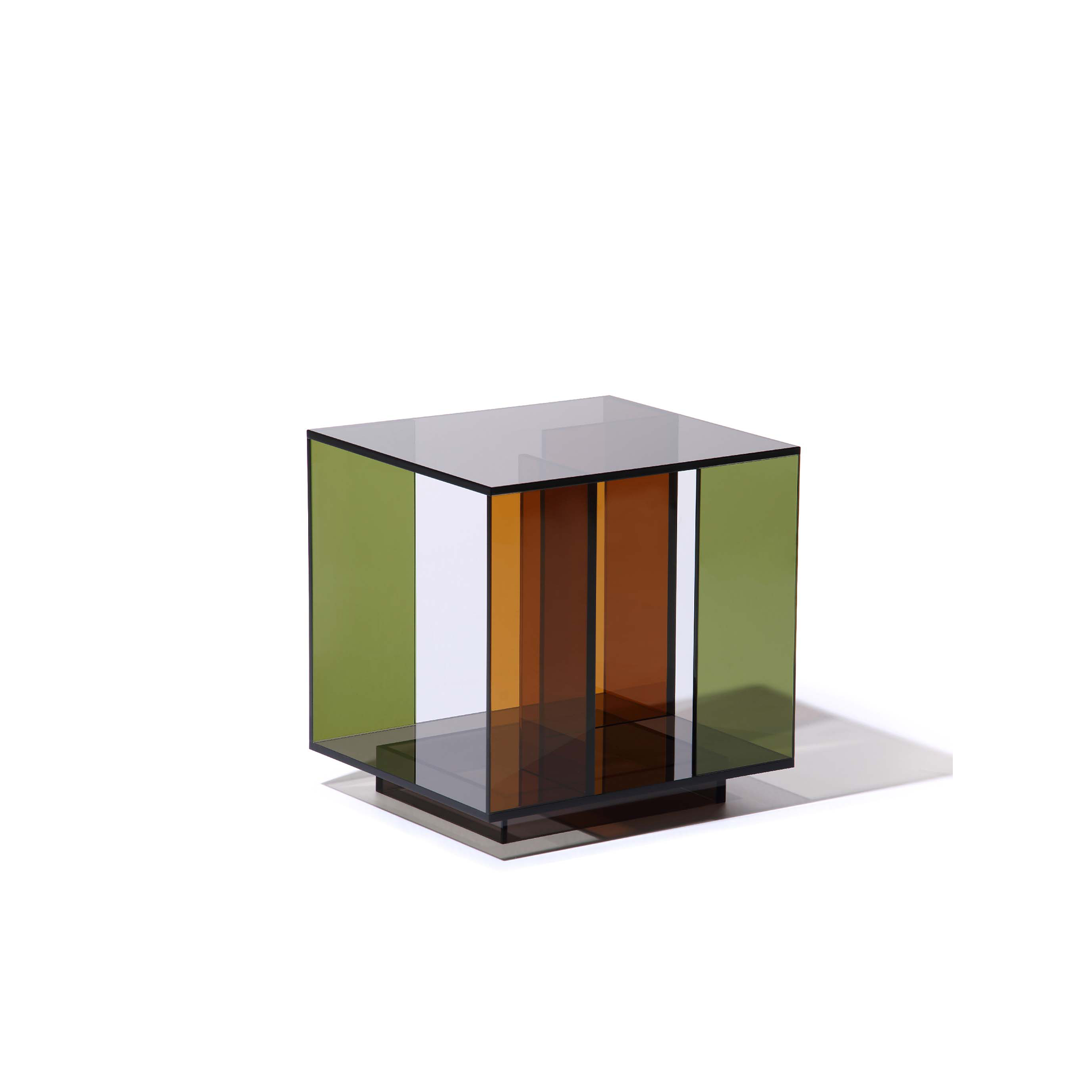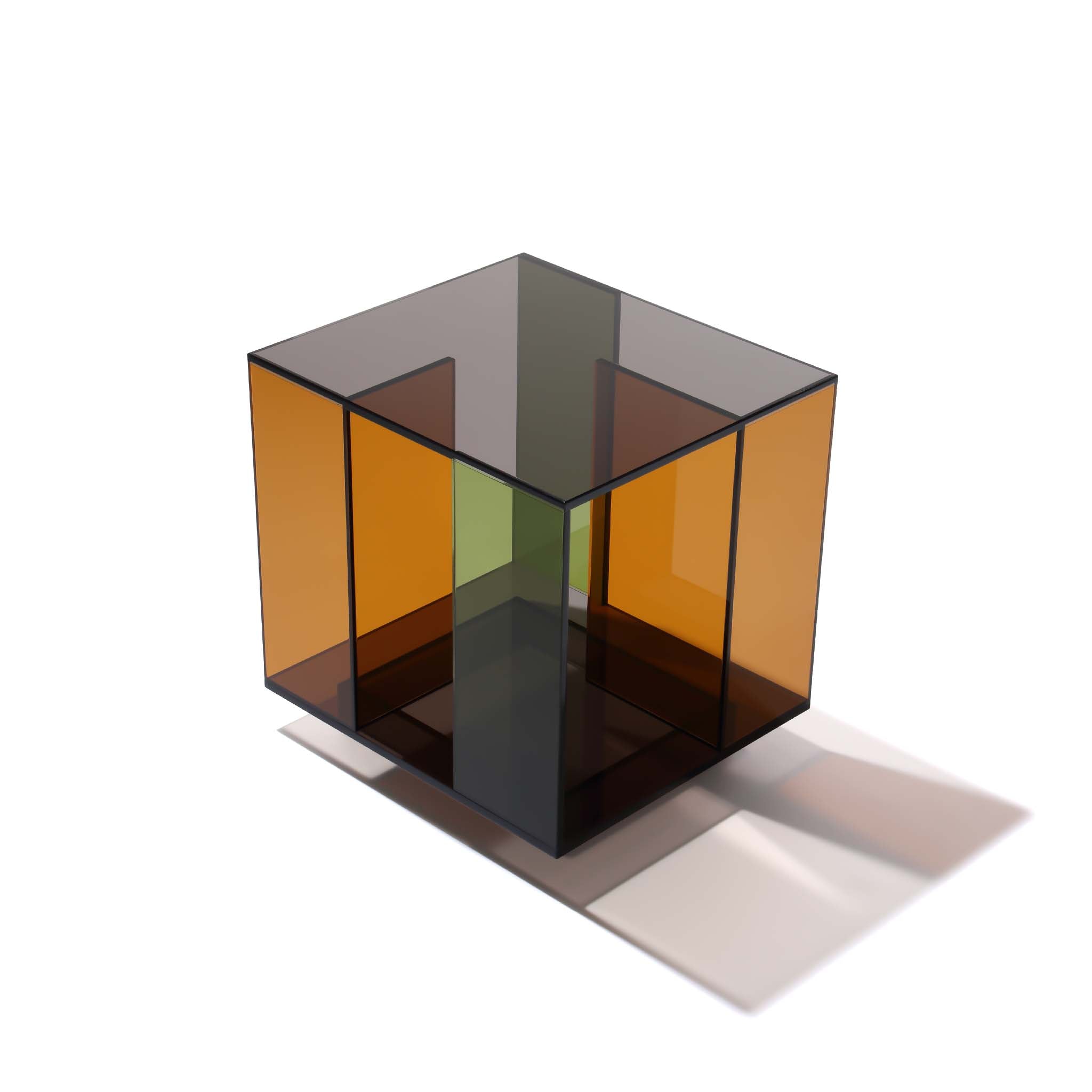 Side table made using a 3 acrylic materials. Each colour casts different shadows pending on which environment they are placed. Different storage areas created by vertical panels of Acrylic.