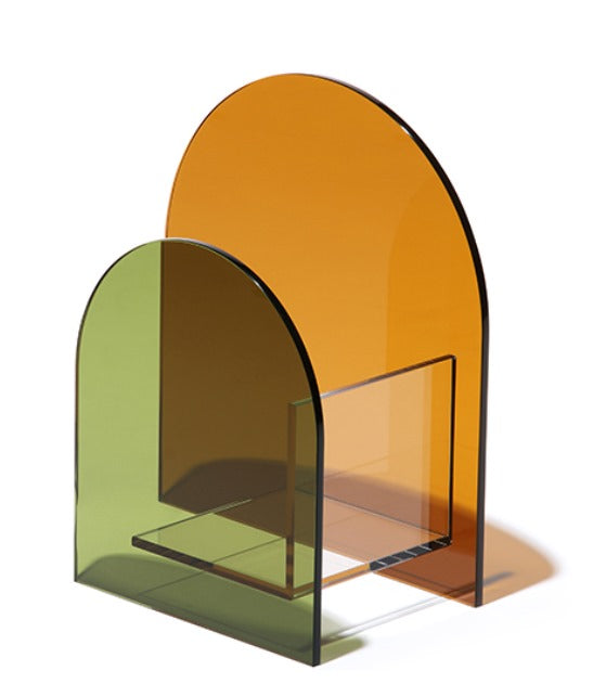 Magazine rack inspired by Sun rises in Bali. Large half circle panels which contrast each other pending on the environment it is placed in. Shadows move throughout the day reflecting the sun's pattern.